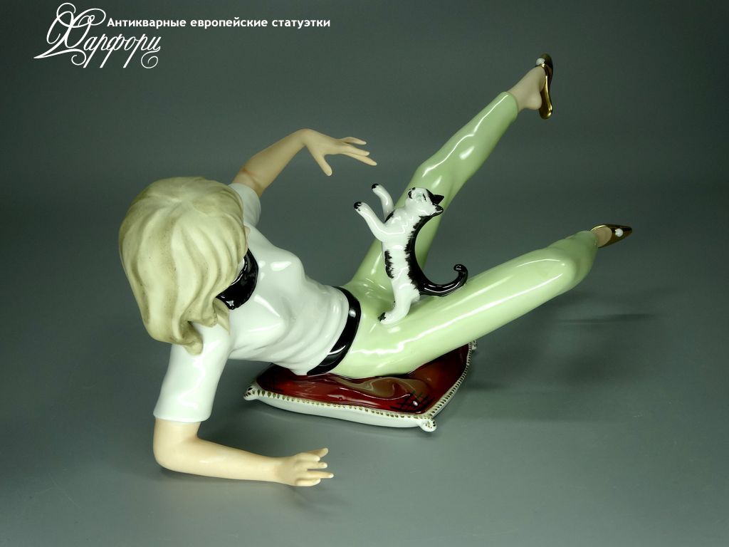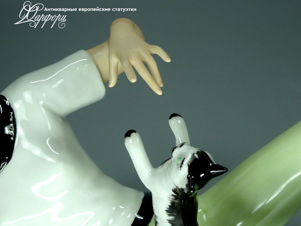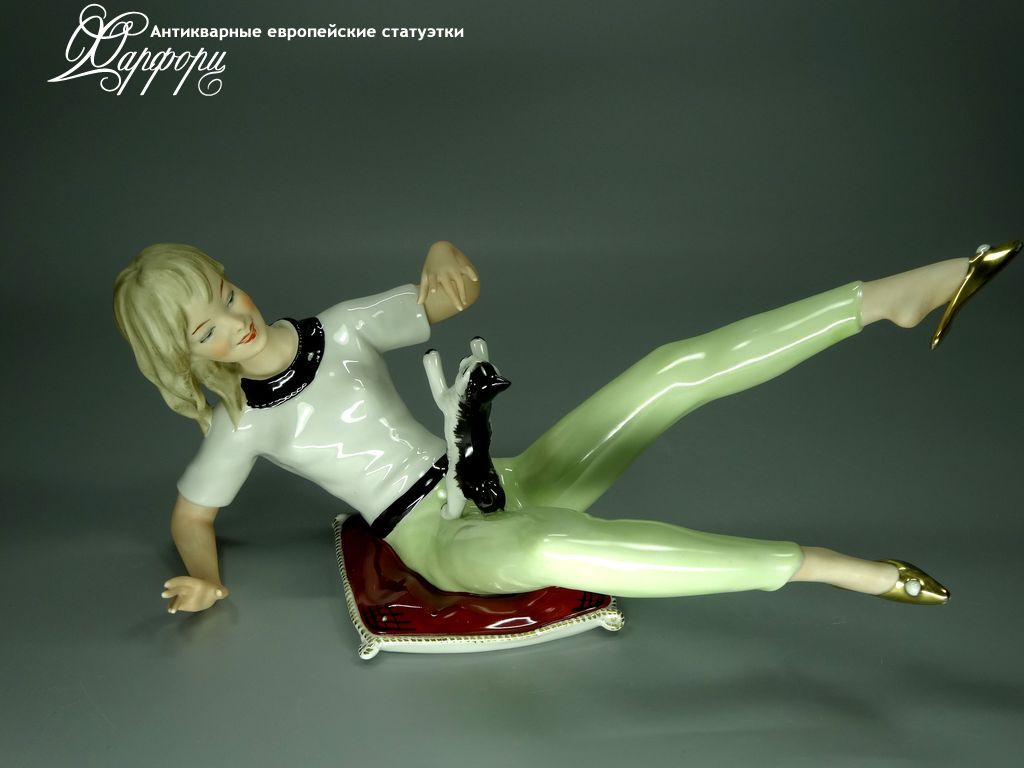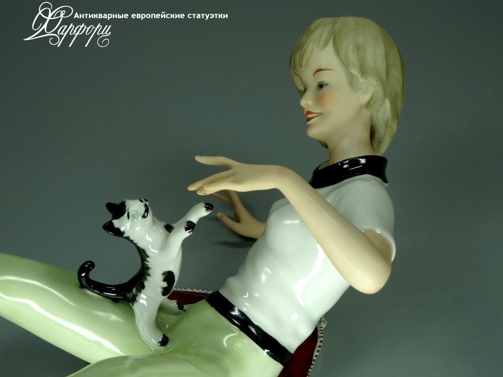 Фарфоровая статуэтка Wallendorf Девушка с кошкой Оригинальная фарфоровая статуэтка мануфактуры Wallendorf (ГЕРМАНИЯ, 1960-70г).